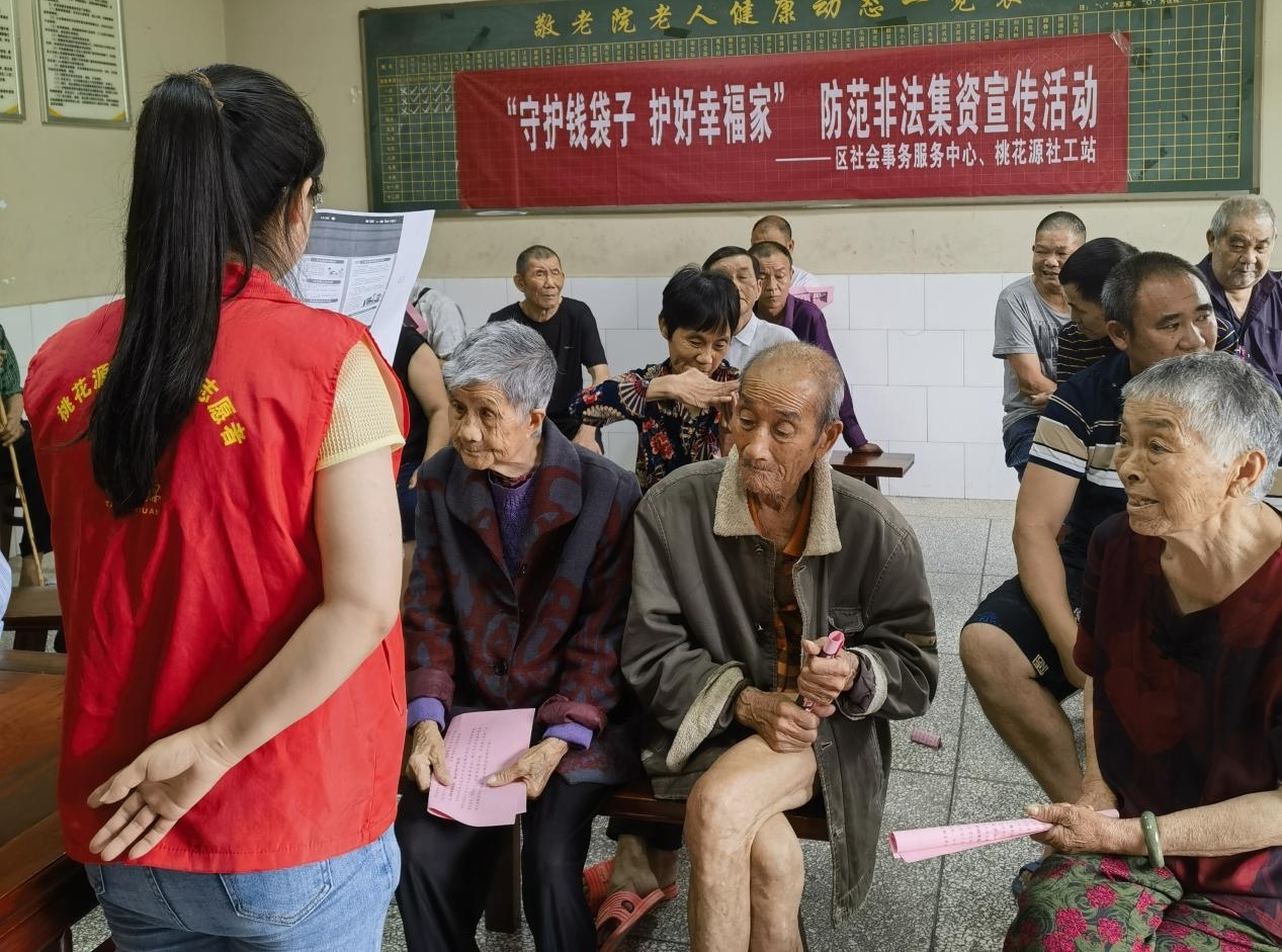 为进一步提高广大老年人对非法集资危害性的认识,主动远离和抵制非法集资,推动敬老院安全发展,桃花源旅游管理区社会事务服务中心、桃花源镇、桃花源社工站在桃花源镇敬老院联合开展主题为“守住钱袋子·护好幸福家”防范非法集资暨安全生产宣传活动。