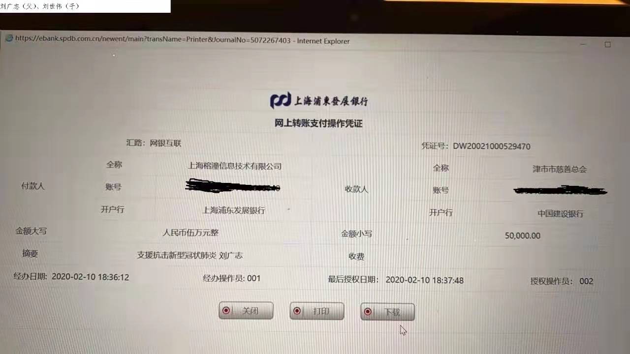 上海榕潼信息技术有限公司董事长刘广志、总经理刘世伟父子两,是津市籍在外创业的成功企业家。接到家乡发来的倡议后,父子俩心急如焚,火速启动从韩国紧急采购紧缺医用口罩的捐赠行动,决定为家乡捐赠价值5万元的高标准医用口罩3000个。后来,韩国供货商因口罩供应紧张而退款。父子俩不假思索,马上将这5万元善款直接打到了津市慈善总会的账户。