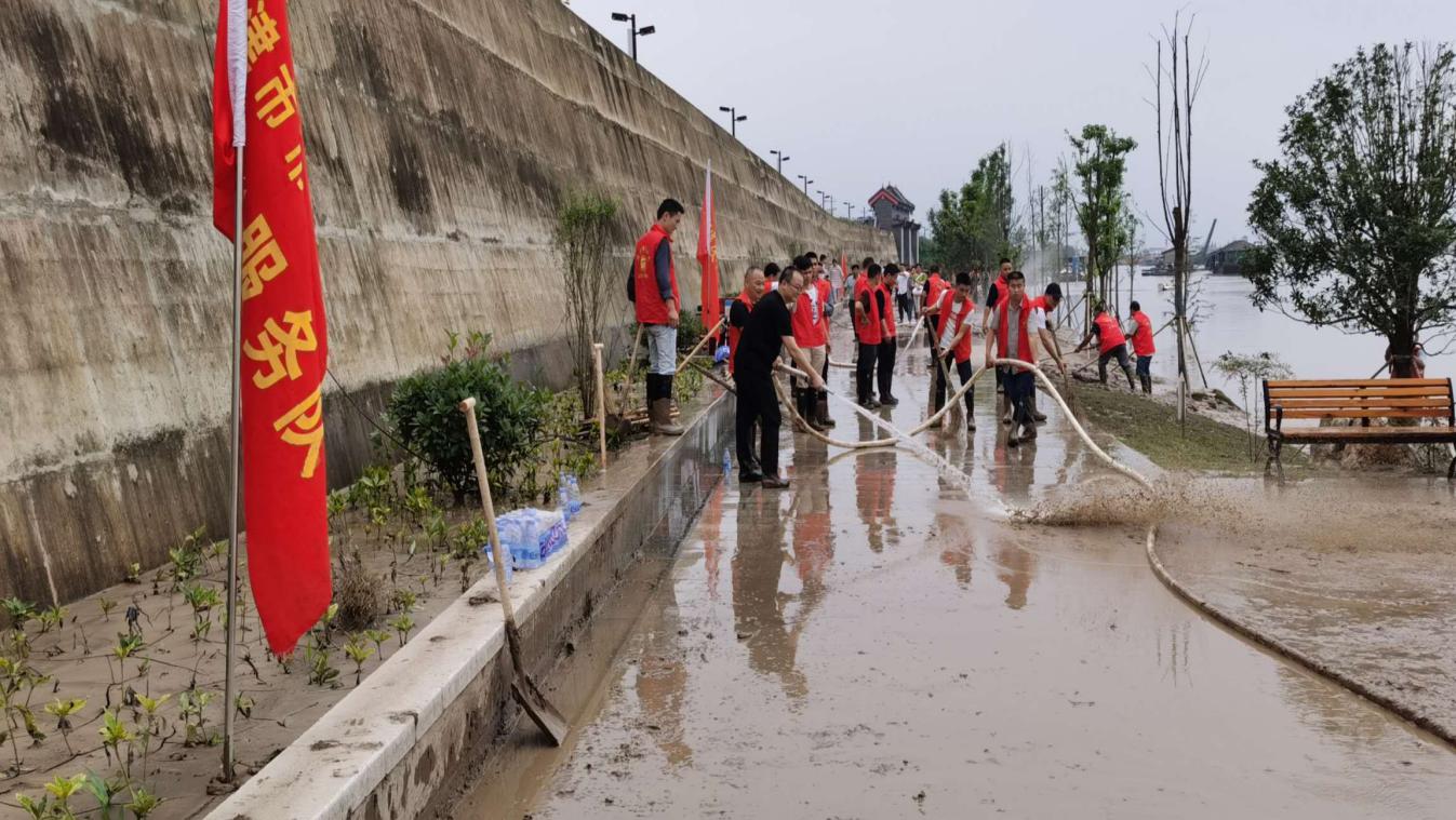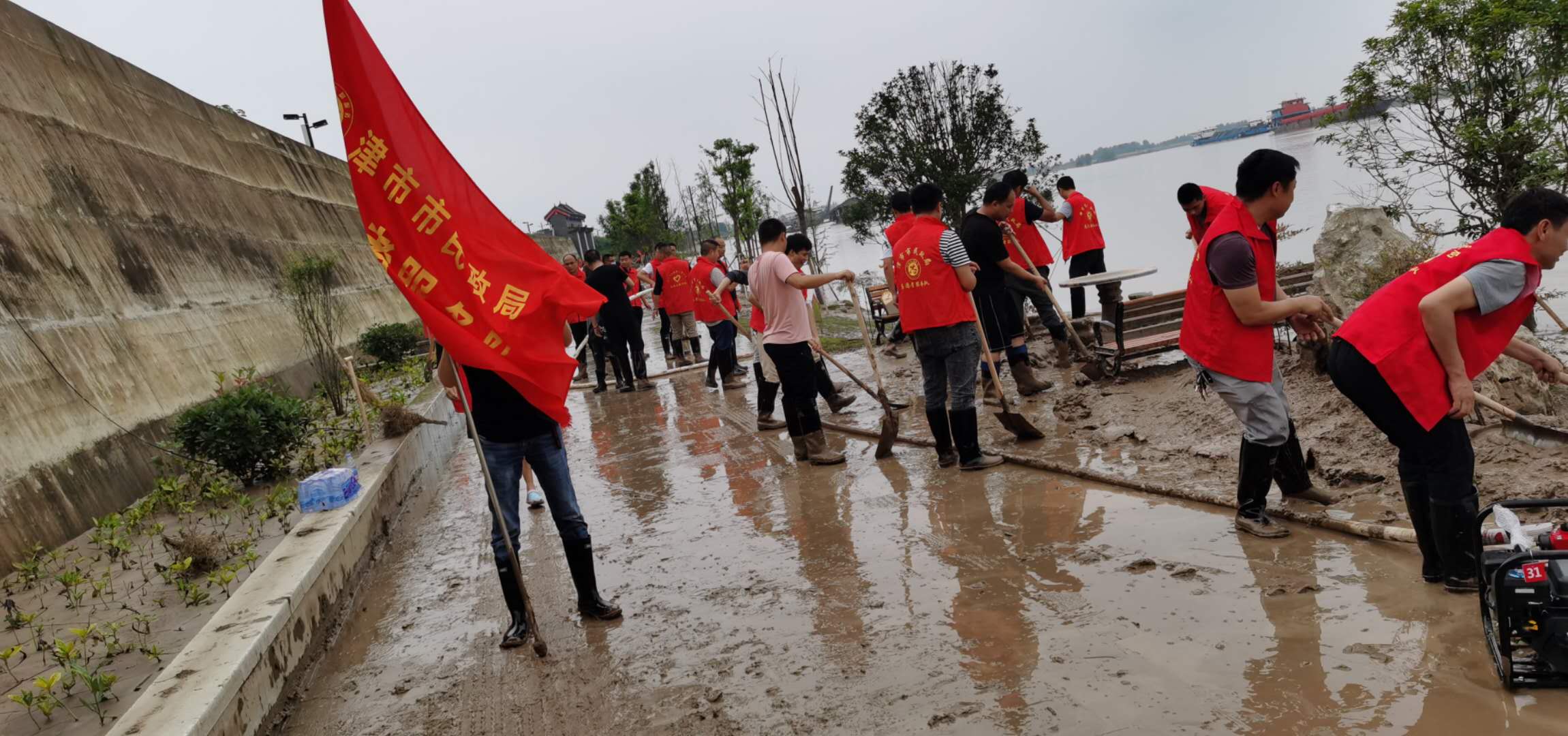 到达民政局责任地段后,志愿者服务队立即投入战斗,从内至外沿大堤墙面、花台、游道、绿化、树木、亲水平台顺序,先用抢板和铁钯将淤泥清理至河道内,再用潜水泵连接水枪将残余泥沙冲洗,最后用扫把就着水势将清洗区域清扫干净。