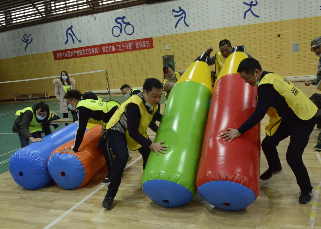 参赛人员共63人分为奋进、彩虹、梦想、飞鹰4个小队,局党组成员每人带一队,在教练的引导下,依次进行了摸石头过河、快乐铅笔、星球大战、一圈到底、袋鼠跳等拓展项目,活动现场气氛高涨,队员们纷纷拿出十分的干劲,为自己的小组“争”分“夺”秒,经过激烈的比拼,桂冠最终由彩虹队摘下。最后,全体干部职工以一场拔河友谊赛为这场运动会画上了一个圆满的句号。