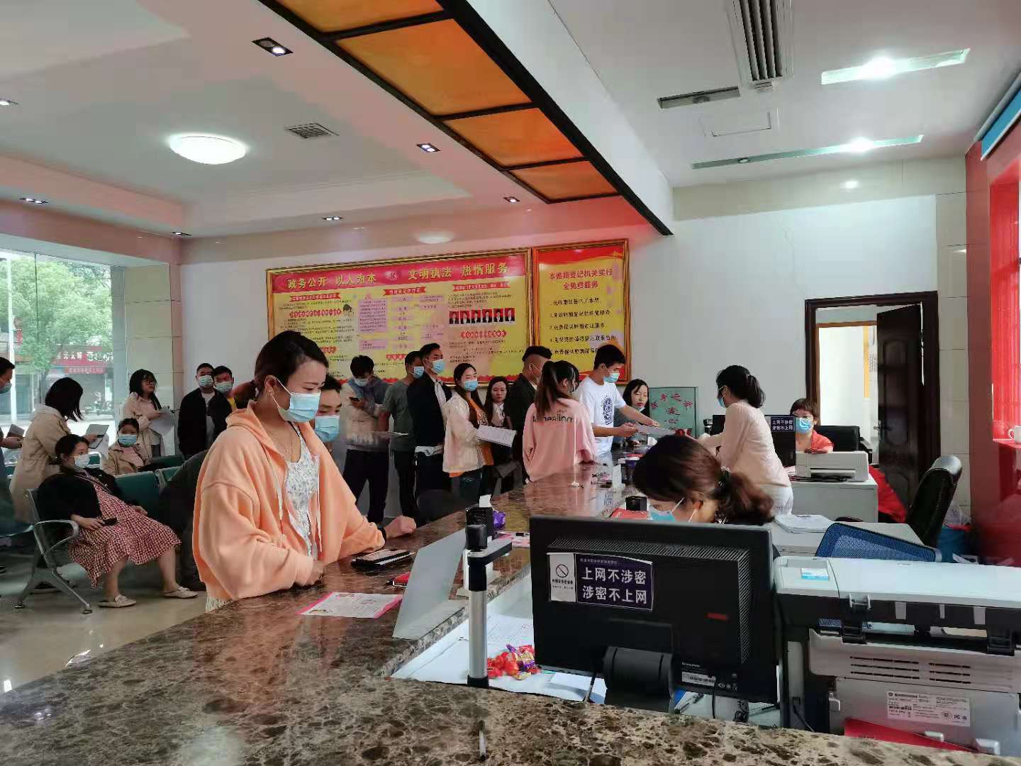 县婚姻登记事务中心内新人排队领证