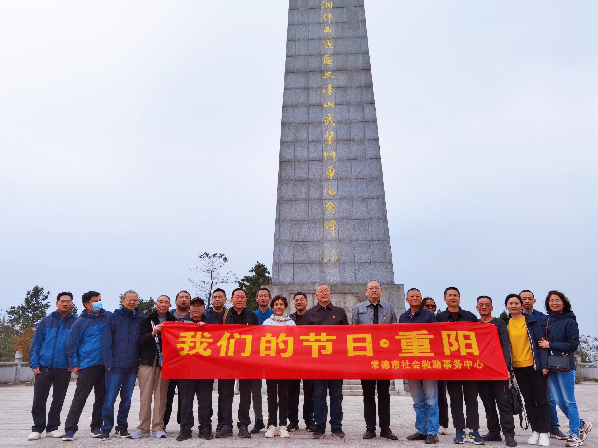 登高是重阳节的传统,沿着山路走向山顶,干部职工陪着老同志慢慢向上,尊老、敬老的意识化为自身的行动。来到山顶,“湘鄂西苏区太浮山武装斗争纪念碑”屹立山顶,铭刻着烽火岁月的革命传承与激情奋斗,全体参与人员在纪念碑前,追忆红色岁月,缅怀革命英雄。