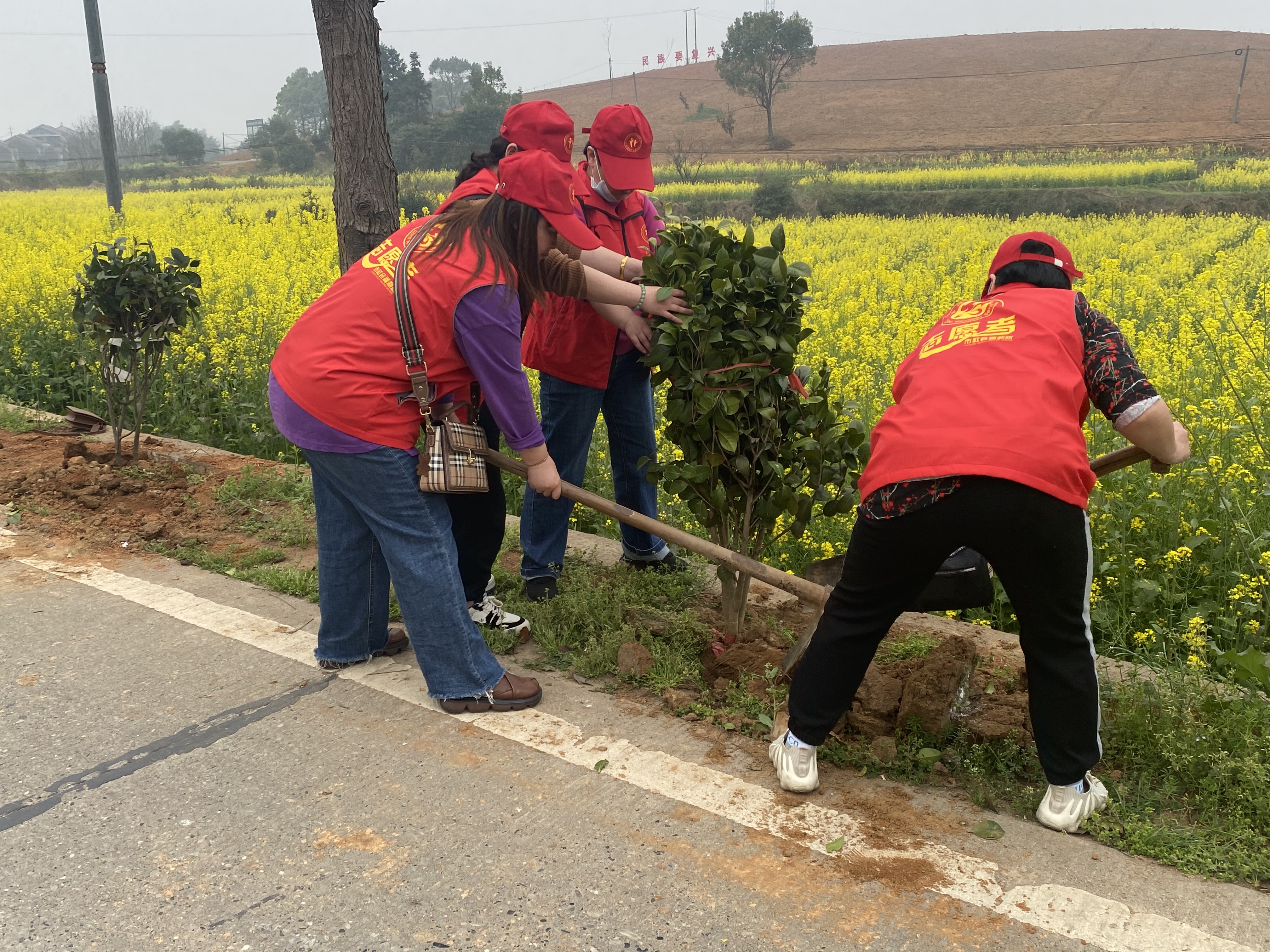 志愿者们分工合作、配合默契,认真细致的栽种树苗
