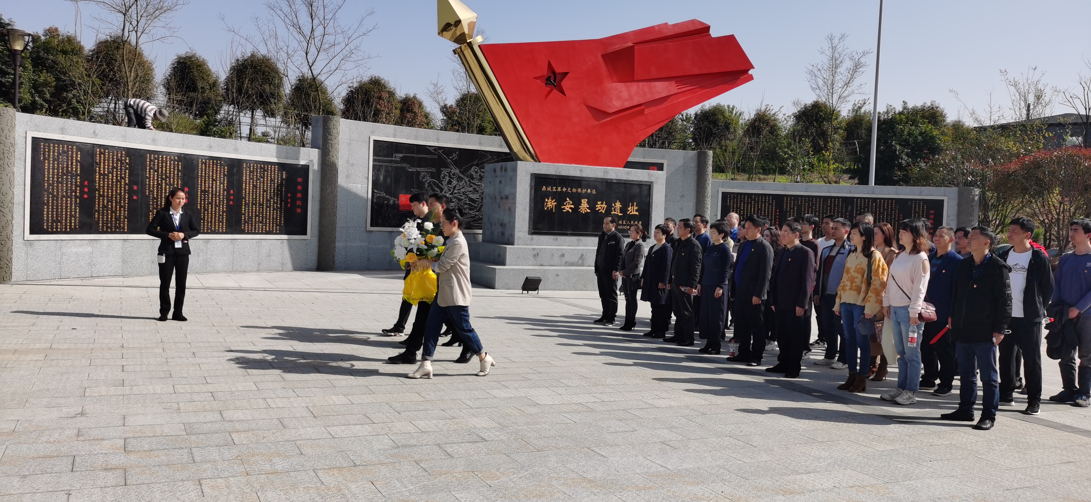 大家首先参观渐安暴动纪念园,向烈士敬献了花篮,重温了入党誓词。1927年9月中旬,原中共常德地委委员、常德县农协委员长陈昌厚和共产党员廖顺之、谭青之等人,潜入家乡渐安区(今石板滩一带)。经过秘密串联和周密发动,在石板滩的山坳里召开千人以上大会,恢复渐安区农民协会,举行农民武装暴动。暴动队火烧区公所,处死不法豪绅李白儿,使国民党反动派大为惊恐。此后,陈昌厚、廖顺之、谭青之等人带起40多名共产党员和农会骨干,潜入常德和桃源两县交界的黄叶岗山区,组成常德县黄叶岗农民武装自卫队。陈昌厚任党代表,谭青之任总指挥,赵文彩、段猷庭分别担任正、副 队长。他们白天藏入山中,夜间下山惩豪绅、打团防,消灭敌人10多人, 缴获长短枪10余支。队伍逐渐扩大至100多人枪,搞得渐安区的地主豪绅日夜不宁,四处逃散,也使国民党的“清乡”队不敢轻易在这一带活动。